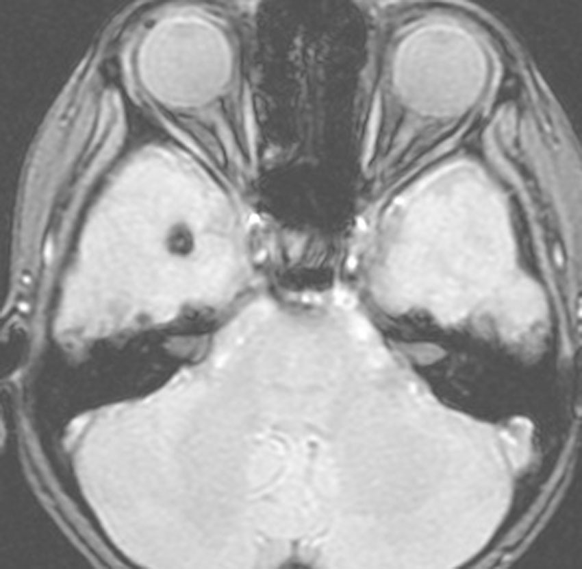 - 低信号(黒いシミみたいなもの)として脳内たくさん見られることがあります