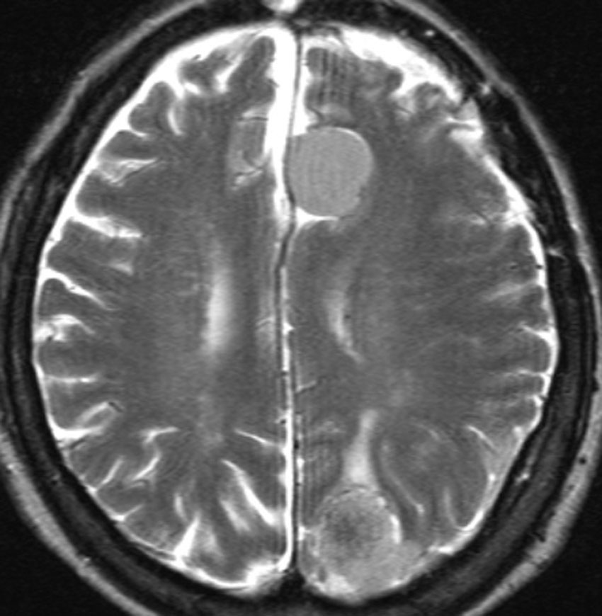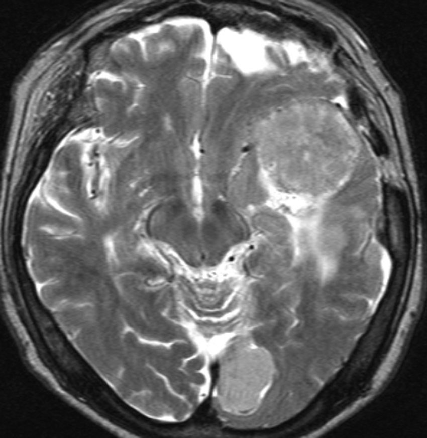 50歳ころから15年間に3回の開頭手術を受けている患者さんです。parasagittal, falx, convexityなど6個の髄膜腫がすでに摘出されています。左側だけ,テント上だけに髄膜腫が20個くらい多発していました。これらはグレード1で,anaplastic meningiomaの転移ではありません。