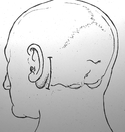 - 耳介後部にわずかな部分剃毛をして,乳様突起の後部を縦に数cm切開します