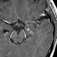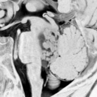 7才の時に音読でつかえるようになり,眼で何かを追っているような欠伸発作(左側頭葉てんかん)を繰り返すようになり,強直間代発作を生じて腫瘍が発見されました。下側頭回底面の皮質に発生した境界明瞭な腫瘍であり,周囲に脳浮腫を伴っています。T2強調画像で線維成分の多い硬い部分は低信号に,軟らかい部分はやや高信号となり,ガドリニウムでheterogenousに増強されます。グレード1の神経節膠腫としては非典型的な画像所見で術前診断は難しいもので,PXA pleomorphic xanthoastrocytoma も疑いました。もちろん治療としては開頭手術での全摘出です。術後に発作は消失しています。