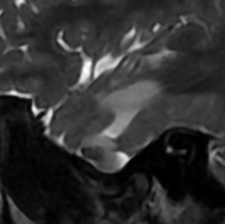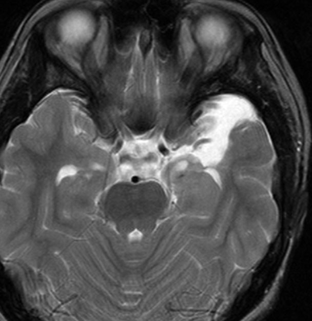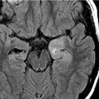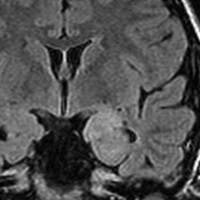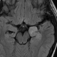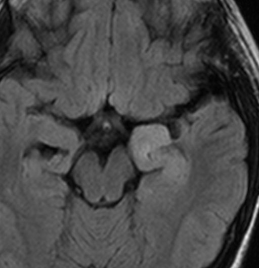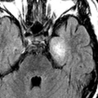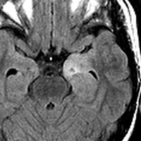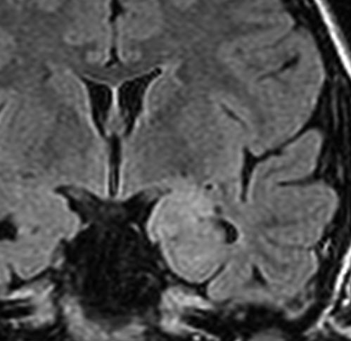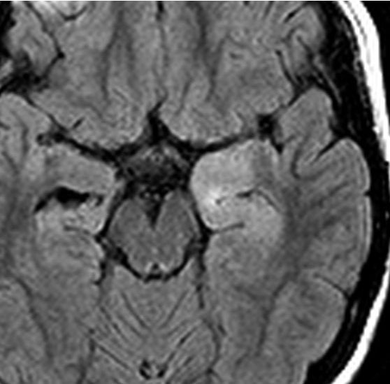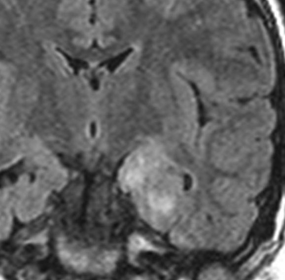 左内側側頭葉グリオーマ mesial temporal glioma と呼ばれる腫瘍です。左の扁桃体,海馬鉤,海馬,海馬傍回に腫瘍が浸潤しています。T2強調画像とFLAIRでまだらな高信号で境界ははっきりしません。mass effectが少なく,増殖増大傾向のある腫瘍には見えないのが特徴です。下段右のように部分的にガドリニウム増強されるのも神経節細胞腫の特徴かもしれません。しかし,神経節膠腫,乏突起膠腫,乏突起星細胞腫(グレード2)なども疑われます。