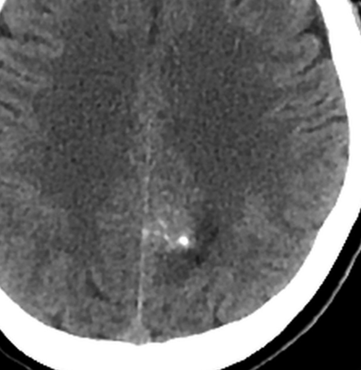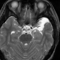 無症状で偶然発見されたものです。CTで石灰化があり,部分的にガドリニウム増強されます。乏突起膠腫グレード2との鑑別が難しい例です。乏突起膠腫より放射線化学療法に治療抵抗性ですから,もちろん治療選択は全摘出です。