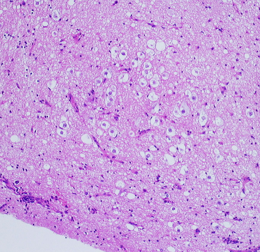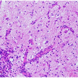 大脳皮質に大型の核を有する円形の神経細胞が散在しています。神経細胞間にグリア細胞がありますが腫瘍性増殖を示しません。MIB-1は1%以下でした。血管周囲にリンパ球浸潤があります。