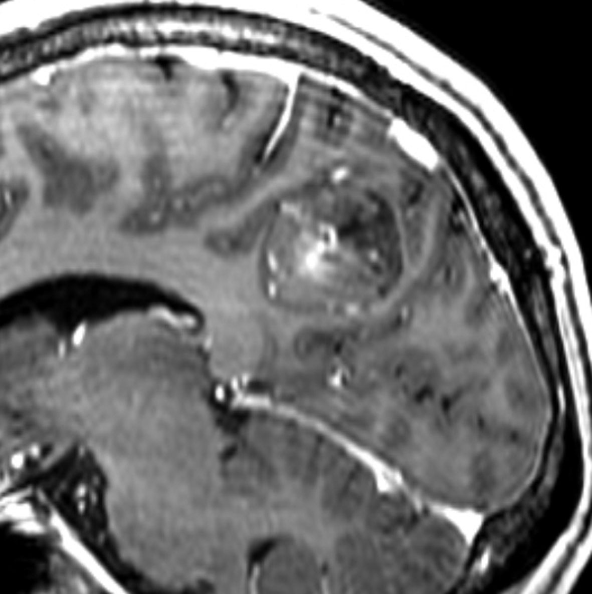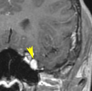 てんかん発作が難治化したために全摘出をしてから,3年後に生じた再発のMRI画像です。もともと左下側頭回底部にあって境界明瞭で完全摘出できたと考えていましたが,硬膜に癒着するような小さな脳表面再発が生じました。画像で見える再発像の周囲の軟膜が硬く,周囲表面の脳皮質を含めて,supratotal resectionしました。それ以降,再発はありません。