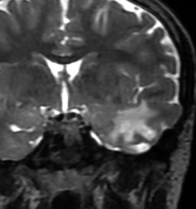 10才の時に,複雑部分発作(症候性てんかん)で発症しました。吐き気を感じた後に嘔吐して意識が遠くなる(意識減損)という症状であり,側頭葉てんかんです。脳波では左側頭葉に徐波律動がみられました。発作は頻回でしたがカルバマゼピンの投与で抑制されていましたが,MRIで腫瘍が発見されました。