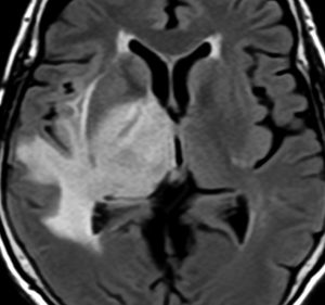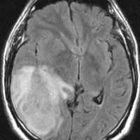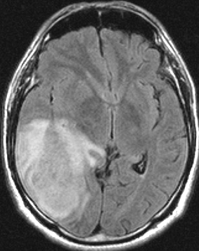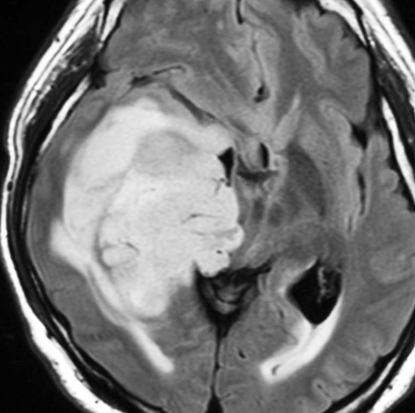 • しかし,ほんとうの腫瘍の広がりは,T2強調あるいはFLAIR(フレア)という画像で,白く滲むように写る部分すべてです