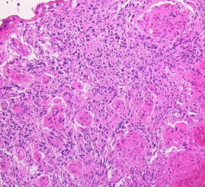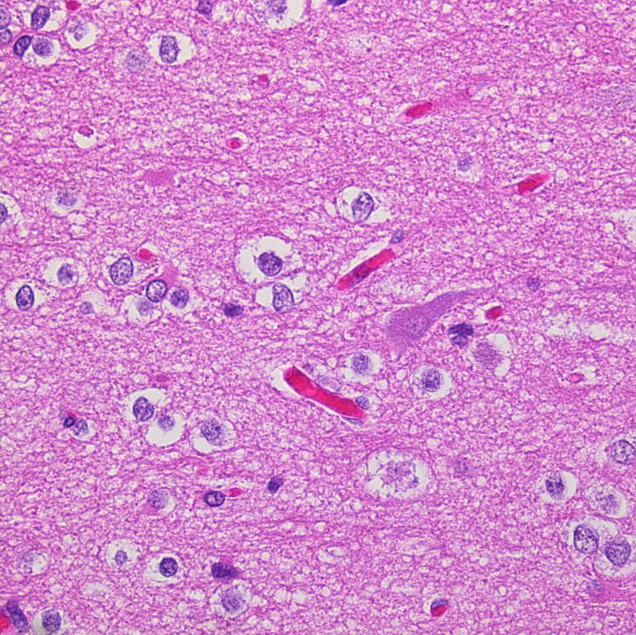 下の病理写真は,ある患者さんから私に送られたものです。20代で前頭葉の膠芽腫になってから21年経って生存しておられるということです。2度の開頭術と放射線治療と化学療法(複数回)を受けておられます。患者さんに病理診断が間違っているのではないかと返事をしたら,下にある画像を送ってくださいました。病理診断は,一見したところは多形膠芽腫 グリブラに間違いありませんでした。でも,ーーー