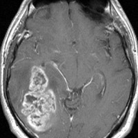 典型的な膠芽腫のガドリニウム増強画像です。右の側頭葉から発生したために目立った症状が無く,この大きさで発症しました。何となくボッとしていると言うのが訴えでした。腫瘍の周囲がガドリニウムで白く増強されて,内部は壊死で低信号(黒っぽい)になっています。