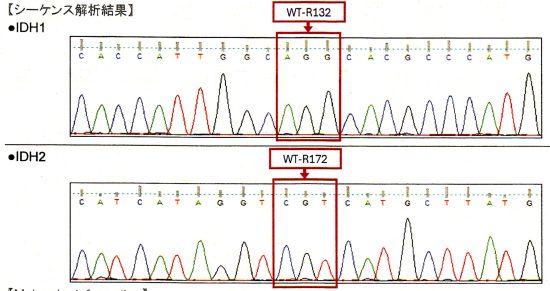 シーケンス検査の結果です,IDH遺伝子とIDH2遺伝子に変異 mutationはないので,野生型とwild typoe いいます。これで星細胞腫との鑑別が確実となります。通常の病院では,免疫組織染色という手段で野生型かどうかをみるのですが誤診の確率が低くはないので,シーケンス検査が必要です。ちなみにこの例ではさらに似たようなMRIと病理所見を示す高悪性度グリオーマを鑑別するために調べたところ,BRAF v600 wild type, H3F 3A K27 wild type, HIST H3B K27 wild type, MGMT score 0でした。