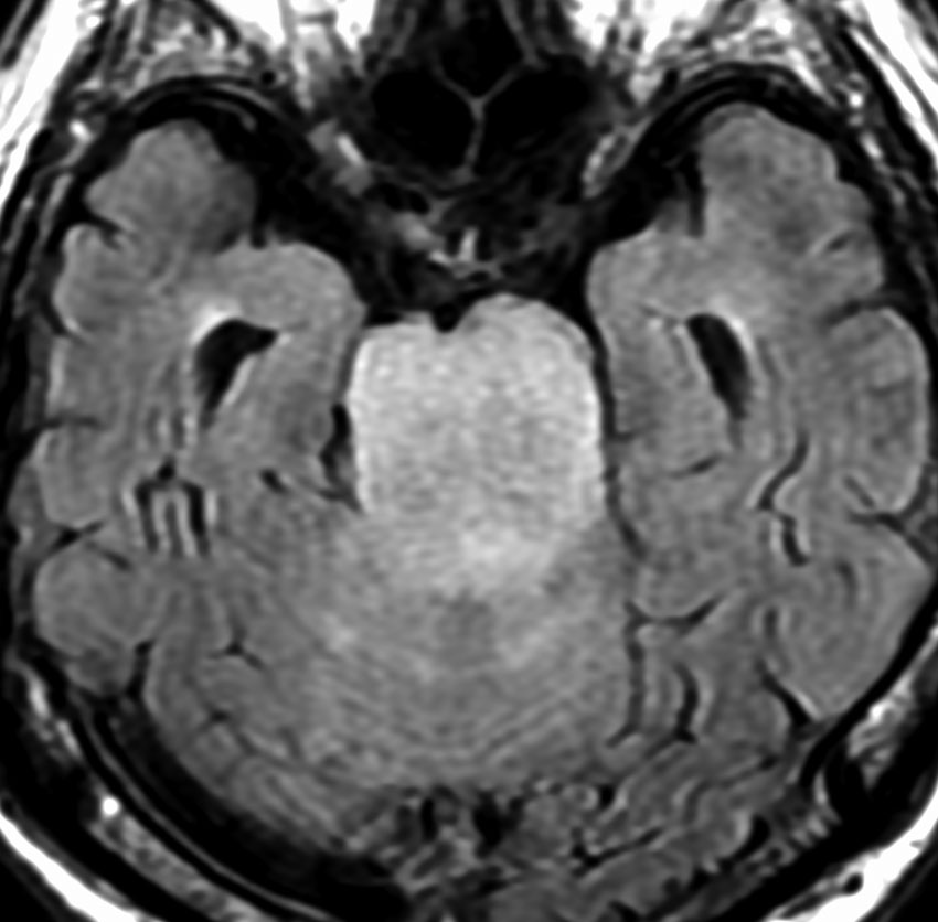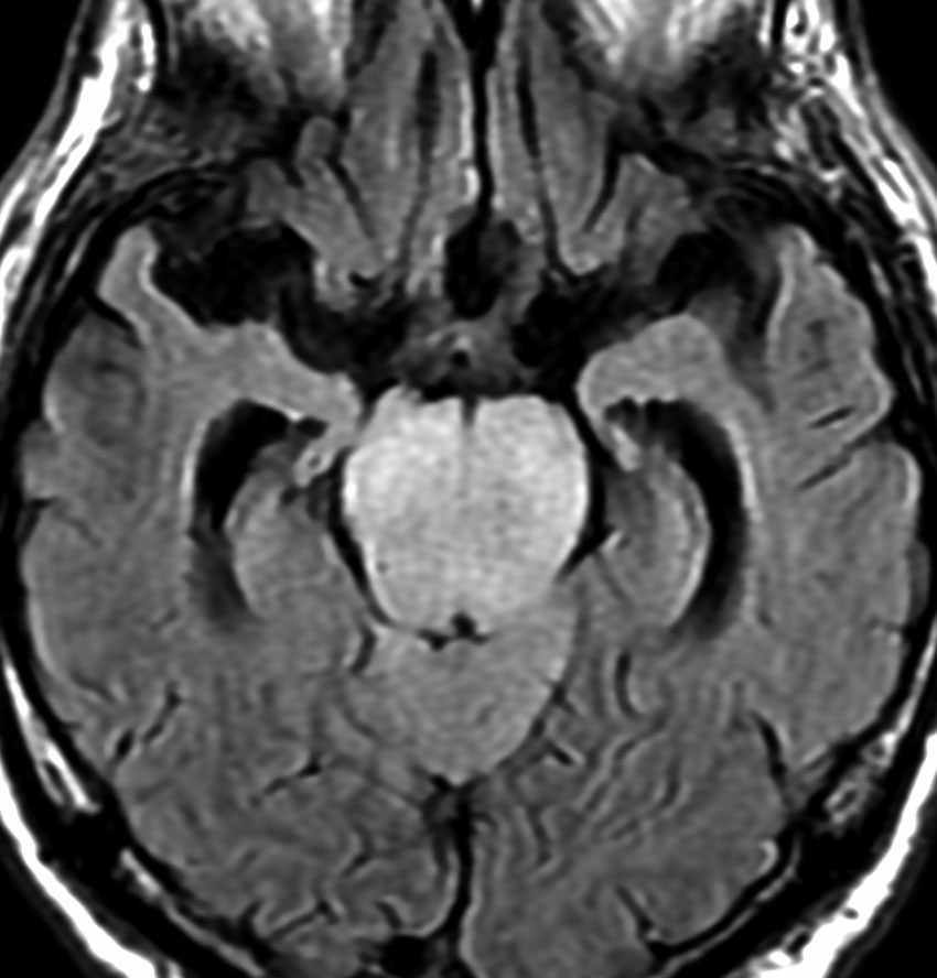 延髄から中脳まで腫瘍があって脳幹部が腫れています。この画像ですと,小児のびまん性橋膠腫(DIPG,びまん性正中グリオーマ)のように見えます