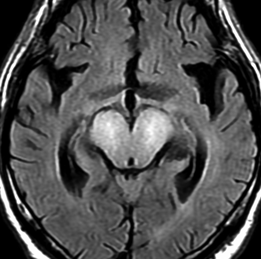 両側視床から大脳基底核,両側大脳半球深部白質,脳梁まで広範囲に腫瘍が存在します。退形成性星細胞腫のようにまだらにガドリニウム増強されます。