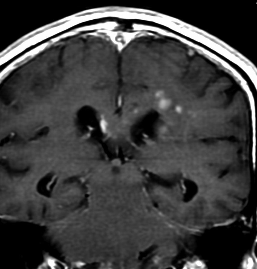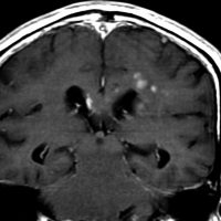 デューク大学からの報告ですから信用度は高いです。一人の患者さんに通常量のテモゾロマイドと全脳照射 50グレイの治療がなされました。治療後腫瘍が完全に消失して38ヶ月の観察期間では再発はなかったそうです。