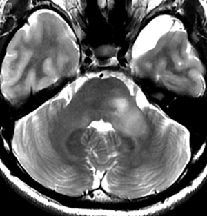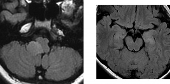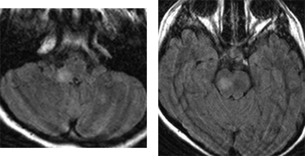 延髄(左の写真)と中脳(右の写真)にFLAIR画像で病変が見られます