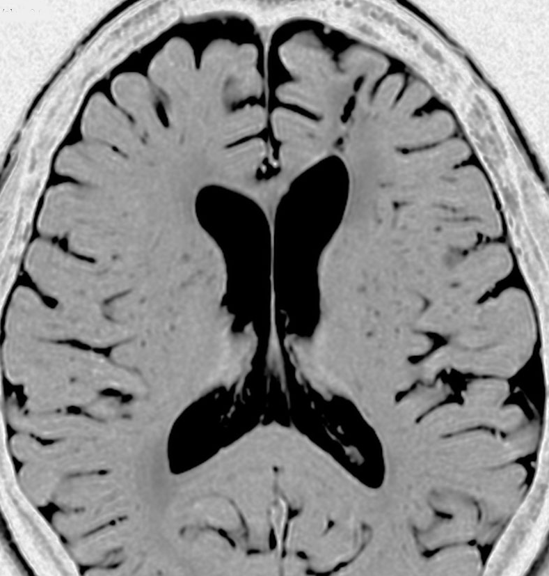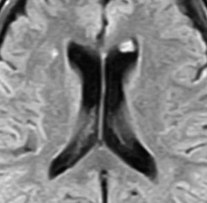 45歳で偶然に発見されたものです。上衣下腫の多発例というより,T1は等信号でガドリニウム増強されません。軽症の結節性硬化症 tubrous sclerosis にみられる多発性上衣下結節 と診断したほうがいいでしょう。