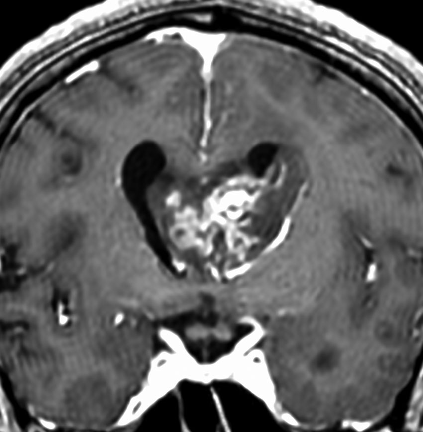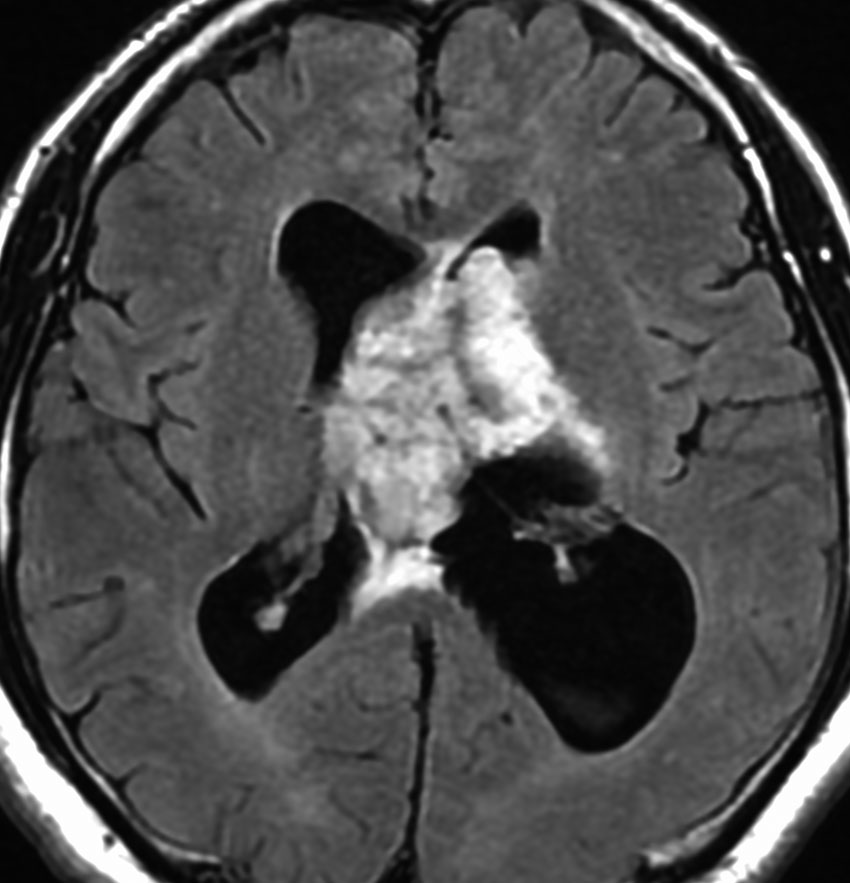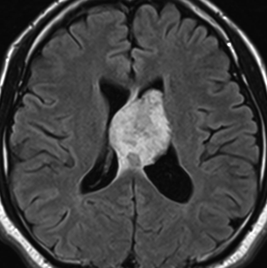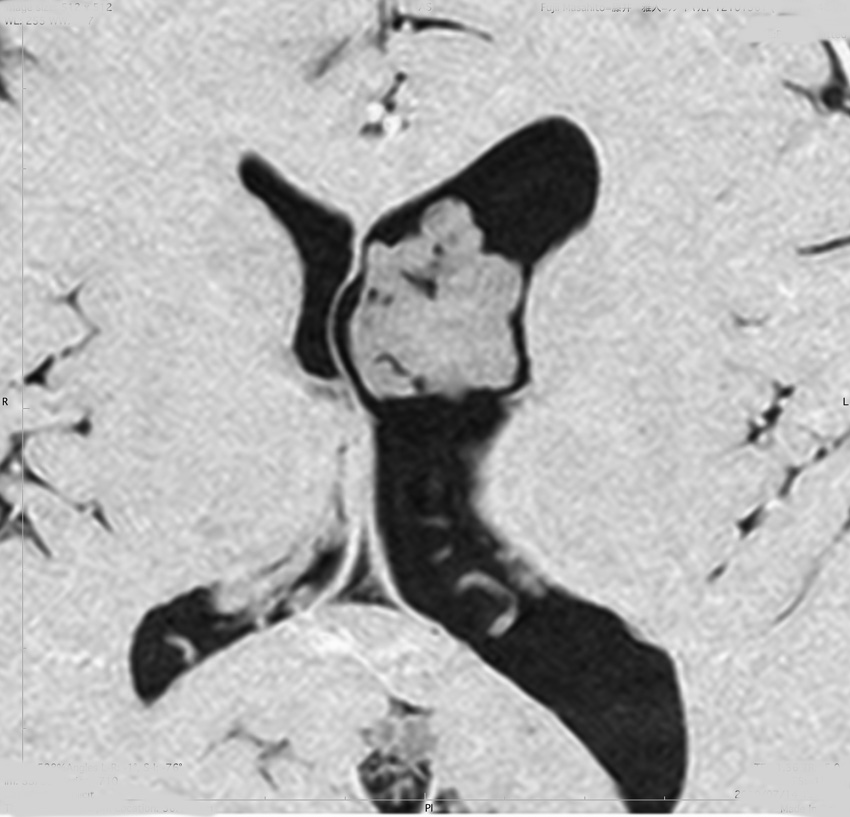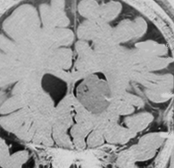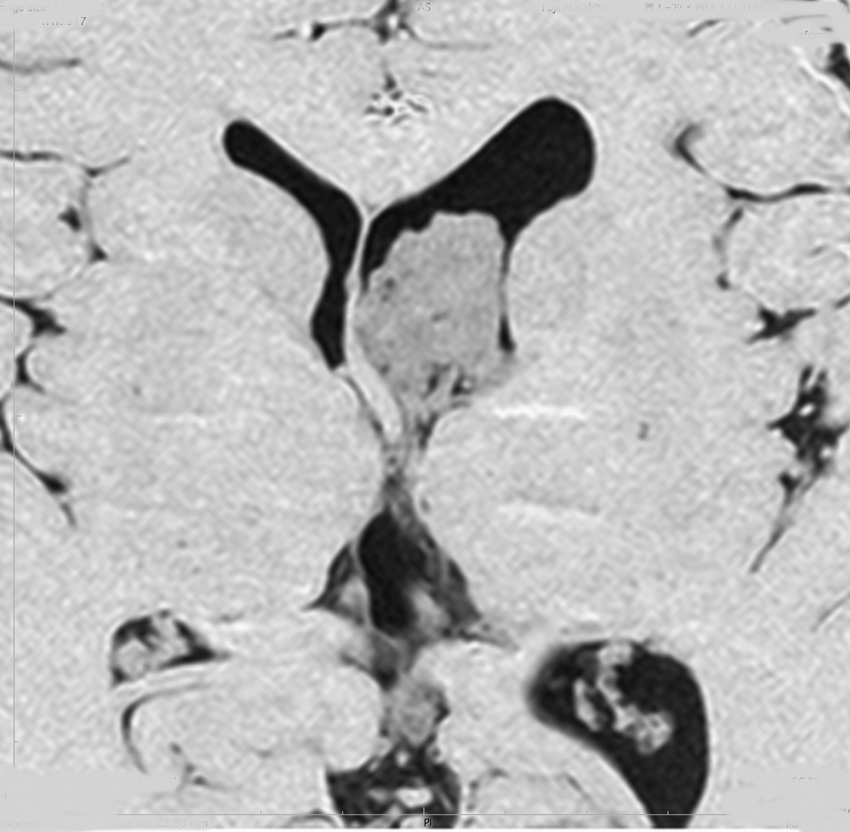 左尾状核から発生したものです。モンロー孔を閉塞して,片側性水頭症となっています。腫瘍がトリュフみたいにゴツゴツしているのも特徴です。
