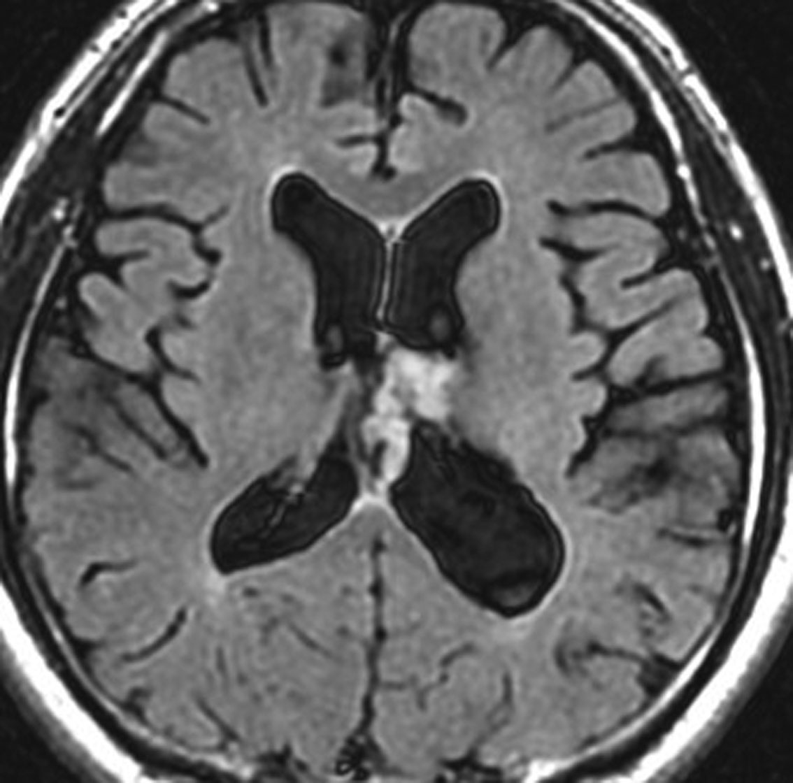 52歳の男性で,2008年に脳ドックで見つかって無症状でした。中枢性神経細胞種 central neurocytomaを疑いましたが,上衣下腫 subependymomaはまったく考慮に入れませんでした。壮年男性でしたから経過観察しました。右側は2019年,11年後のものです。徐々に増大して水頭症になり歩行障害がでてきました。