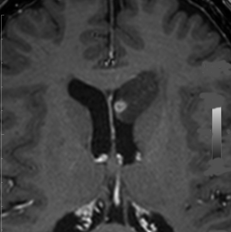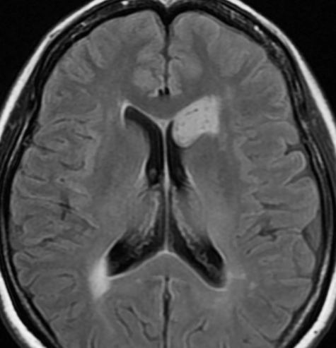 中年男性に偶然発見された15mmくらいの上衣下腫です。側脳室前角の壁にピッタリくっつくようにキノコのように生えています。下の2枚はガドリニウム造影ですが増強されないのが特徴です。この点で中枢性神経細胞腫 central neurocytomaと区別できます。中枢性神経細胞腫はゆっくりですが大きくなる腫瘍です。でもこのような上衣下腫は大きくなるのはとてもまれです。小さいし水頭症にもならないので,なにも治療しないでほっておきます。間違っても開頭手術などしません。