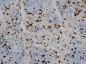 組織診断するとKi-67という抗体で「MIB-1免疫組織染色」ができます。そのMIB-1 (Ki-67) 染色率をlabling indexといいます。黒っぽく染まっているのが陽性細胞,薄い青が陰性細胞です。この例では20%くらいになります。