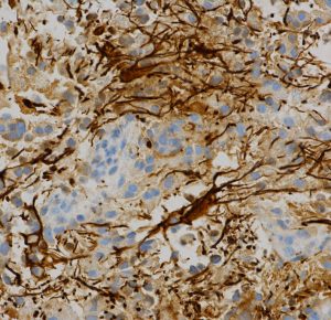 グリア glia, glialは,ギリシャ語の”glue”に由来します。粘っとしたものという意味です。英語の glue は糊(ノリ)です。実際に手術で摘出しようとするとちょっとねばっとしています。そのわずかな粘り,硬い粘液のような感触を手掛りに腫瘍摘出をします。日本語での膠細胞,膠腫の「膠 にかわ」という訳はあまりいただけません。膠ほどには粘性の強いものではありません。