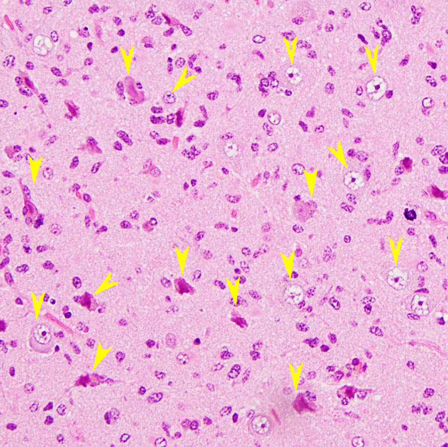 星細胞腫グレード2の組織像です。黄色い矢印は神経細胞で大型です。点のように見えるのがほとんどすべてグリオーマ細胞です。左の画像の被殻という神経細胞 (spindle / large round neuron) のあるところ,右画像の白質というところは,腫瘍に侵されていてもなお正常に機能している脳です。ここにある腫瘍細胞を手術で全部とろうとすれば,この働いている脳(神経細胞と神経線維)もいっしょに取ってしまうことになります。ですから,グリオーマは全部取れないのです。手術だけでは治らないかもしれないと考えて下さい。