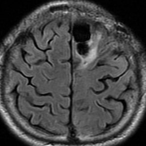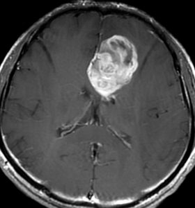 グレード3(かつての退形成性星細胞腫)かグレード4(膠芽腫),おそらく膠芽腫と「予想」できる画像です。確実ではないのですが,この予想は治療計画の上で重要なものです。