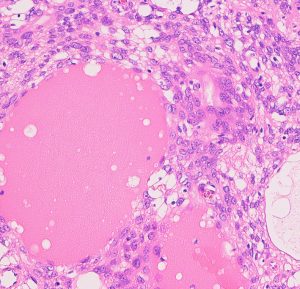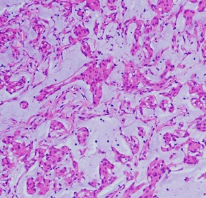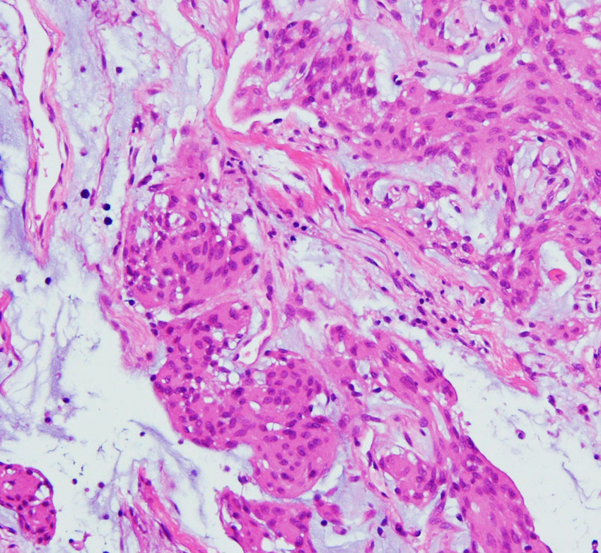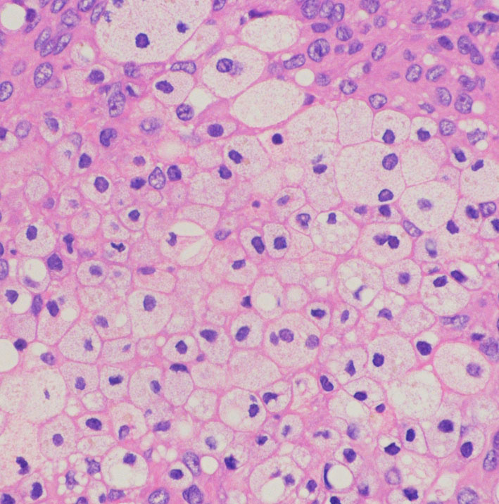 この例は鞍結節に発生した髄膜腫で,T2強調画像では高信号が目立ちましたが骨浸潤はなく,一般的なgrade 1 meningiomaとの鑑別はできませんでした。粘液を含む腫瘍で、好酸性の胞体を持つ紡錘形ないし類円形核の細胞がmyxoid /  chordoid matrixに浮遊している所見です。腫瘍細胞が固まる部分は典型的な髄膜腫の特徴をよく表す組織構造です。胞体内には空胞変性 vacuolated cells が認められました。MIB-1 5%, EMA (+), Cam5.2 (-)。珍しいタイプで,概して大きな髄膜腫としてテント上に発見され,手術後の再発率は高いのでグレード2とされます。Wangは30例中の5例に再発を見たとしていますから全摘出できればそれほど高い再発割合ではありません。
