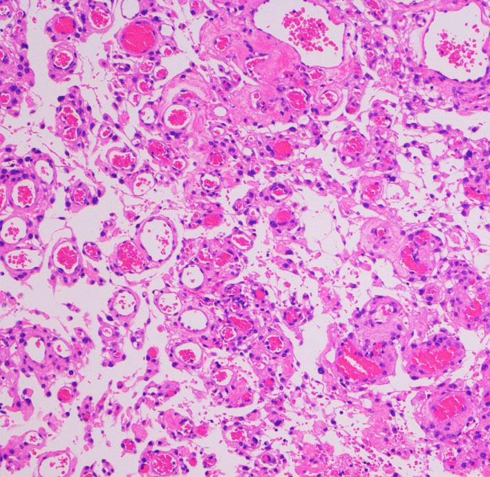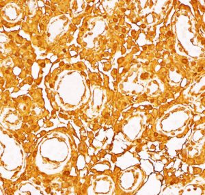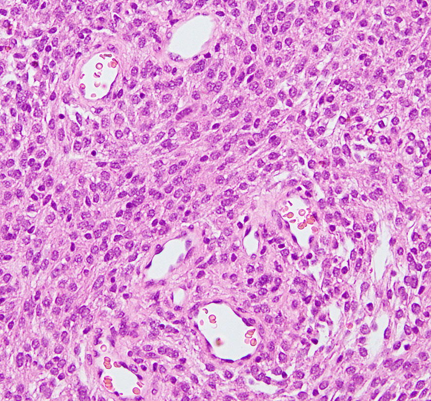 多数の小血管から構成される組織像です。右のvimentin染色は陽性です。