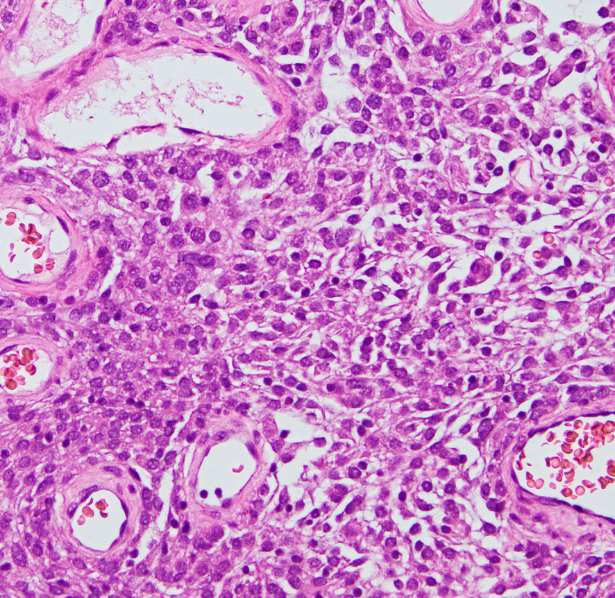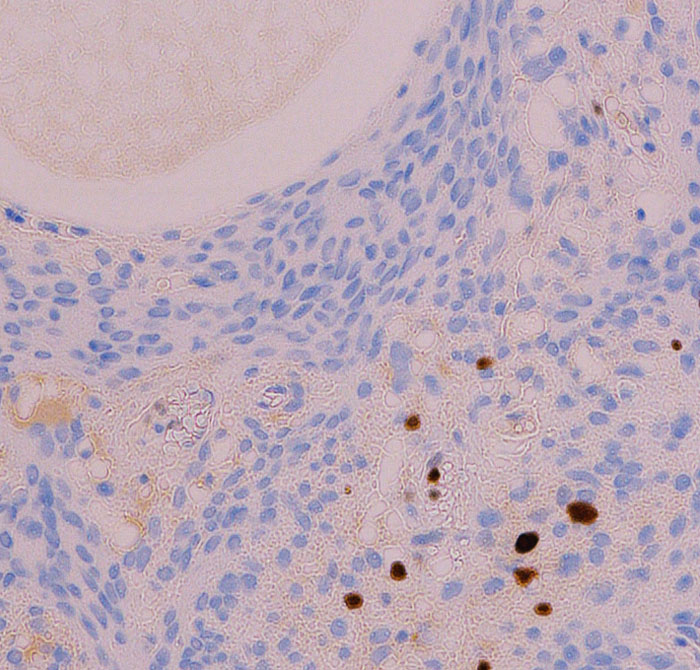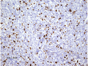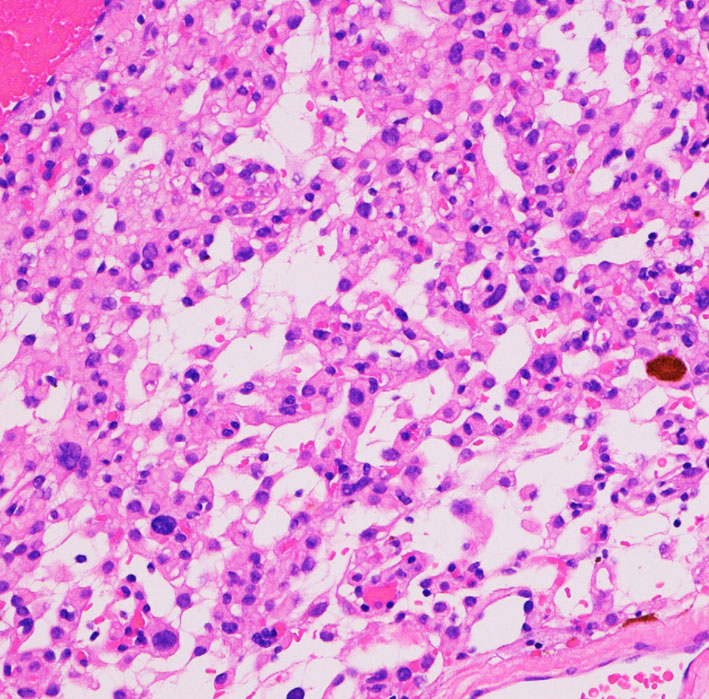 核小体明瞭な大小不同な類円形核からなる細胞境界が不明瞭な腫瘍細胞がみられ,ヘモジデリン貪食マクロファージも認められます。MIB-1染色率は2-3%でグレード1です。