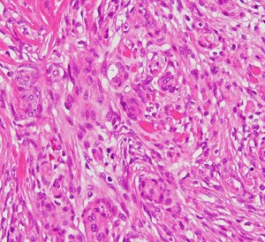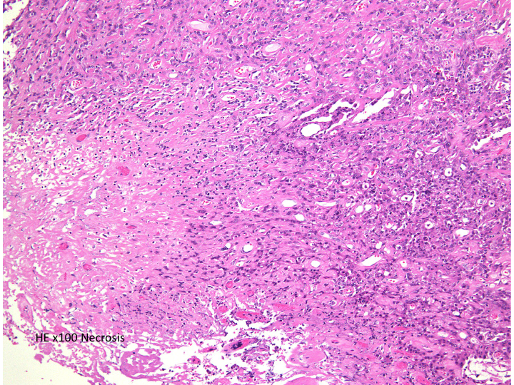 EMAが陽性となることでmeningiomaが示唆されます(左:EMA染色 x200x)。腫瘍の一部でcollagen fiberの多い組織に移行し、核の消失を伴う壊死性変化を示す部位が見られます。