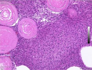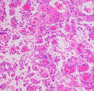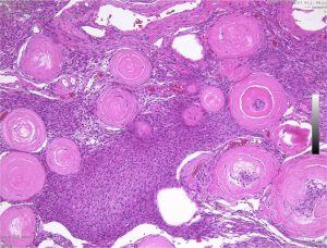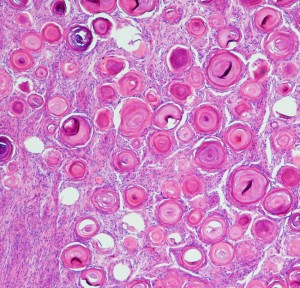 たくさんの砂粒体 psammoma が見られる髄膜腫です。顕微鏡手術では手術中に細かい砂のようなものとして認識されます。この砂粒体は徐々に石灰化 carcification します。写真の中の紫色に変化しているところは,砂粒体が中心部から石灰化して行く過程をみているものです。