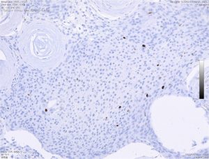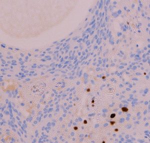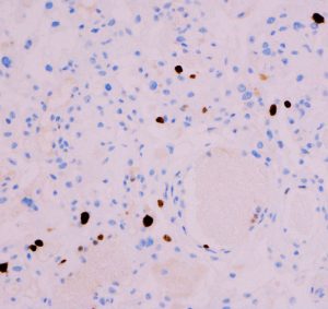 whorl patternが変性すると,無機質な構造へと変化します。meningothelial meningiomaの一部像として重要な所見です。これはとてもゆっくり増大する良性の髄膜腫の特徴でもあります。下の右側のMIB-1(Ki-67)染色では1%くらいが陽性で低値と言えます。