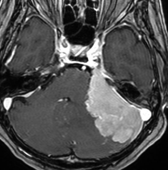 小脳橋角部に発生した髄膜腫ですが,手術中に見た目に真っ黄色で柔らかく,繊維成分のない壊れやすい脂肪組織を摘出しているようでした。