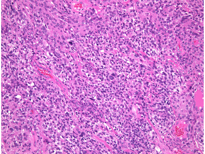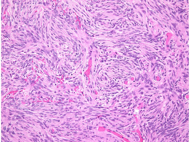 spindle cellの増殖からなるfibrous meningiomaです。神経鞘腫 schwannomaとの違いは,nuclear palisadingが見られないことです。collagen fiberに富む部分(右側)