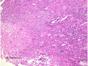 WHO grade 2 atypical meningioma (MIB-1 15%)に認められた壊死像です。この病理部分像からはgrade 2ですが,MIB-1も非常に高率です。さらに,多少なりとも核異型がみられるとgrade 3のanaplastic meningiomaになります。