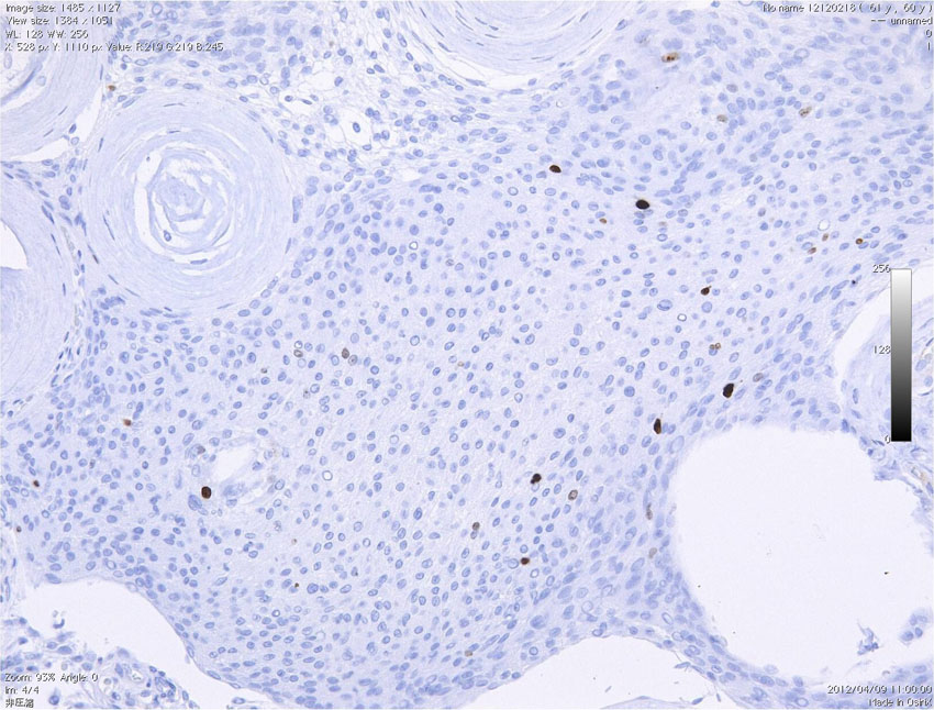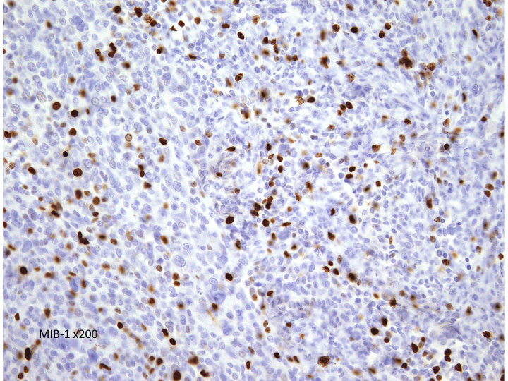 極めて高い細胞密度です。MIB-1は20%に達します。肉腫 sarcoma としての性質を有し,頭蓋内で転移し,摘出しても多発再発します。放射線外科治療でもコントロールすることはできません。