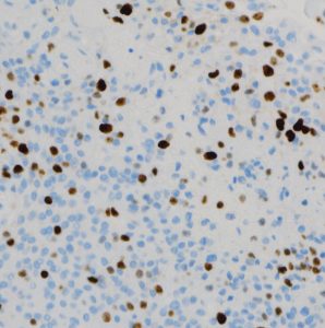 MIB-1染色率は8-10%と高く,臨床的にはグレード2に近い性格を示すものです。