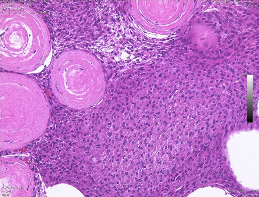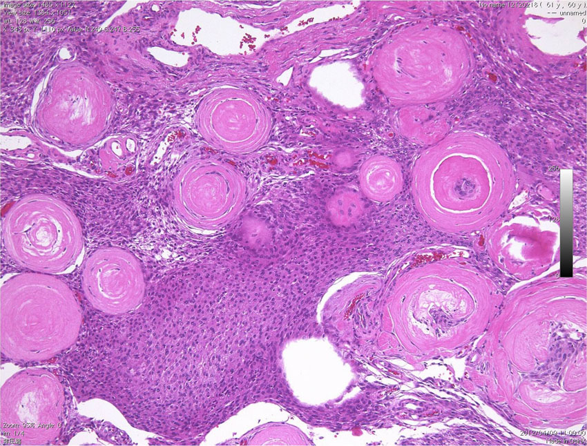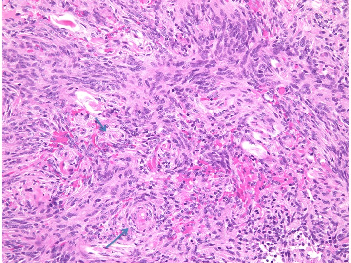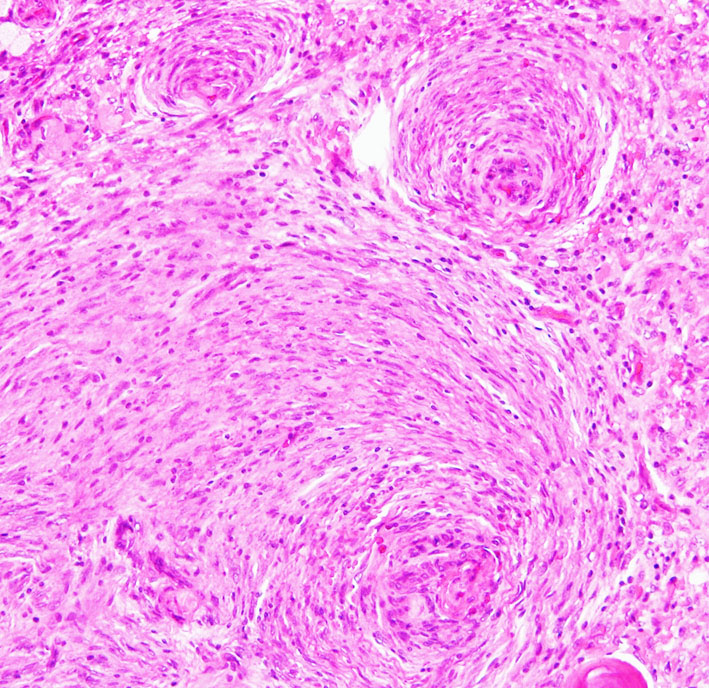 Fibrous meningiomaですが、渦巻状(whorl, long arrow) patternや玉ねぎ茎状 (onion bulb, short arrow) patternなどが見られます。HE x200