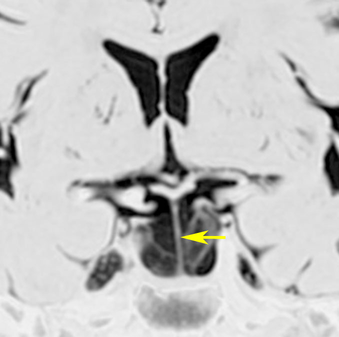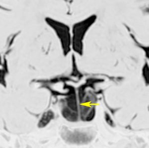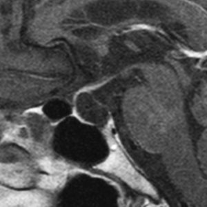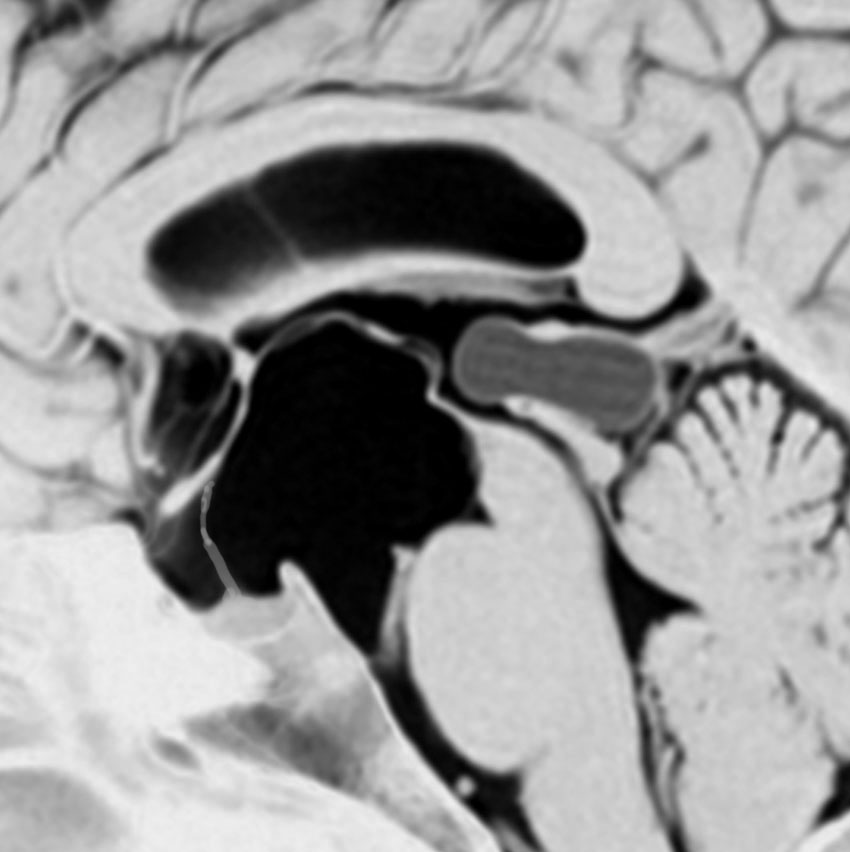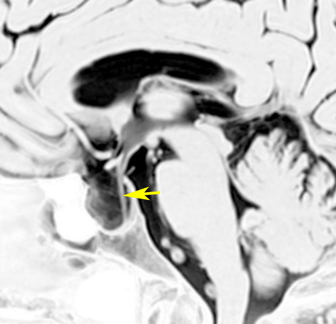 トルコ鞍内後方にくも膜のう胞があり,下垂体は前方に押し付けられて扁平化しています。このようなものでも通常は無症候性で,症状を出すことは珍しいと言えます。