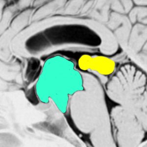 20歳代の女性の無症候性のものです。水色に塗ったのがクモ膜のう胞です。特徴的なのは,下垂体柄が長〜く伸びて細くなっていることです,でも下垂体障害はでません。珍しいことですが,松果体のう胞(黄色の部分)が合併しています。治療の必要がないものです。