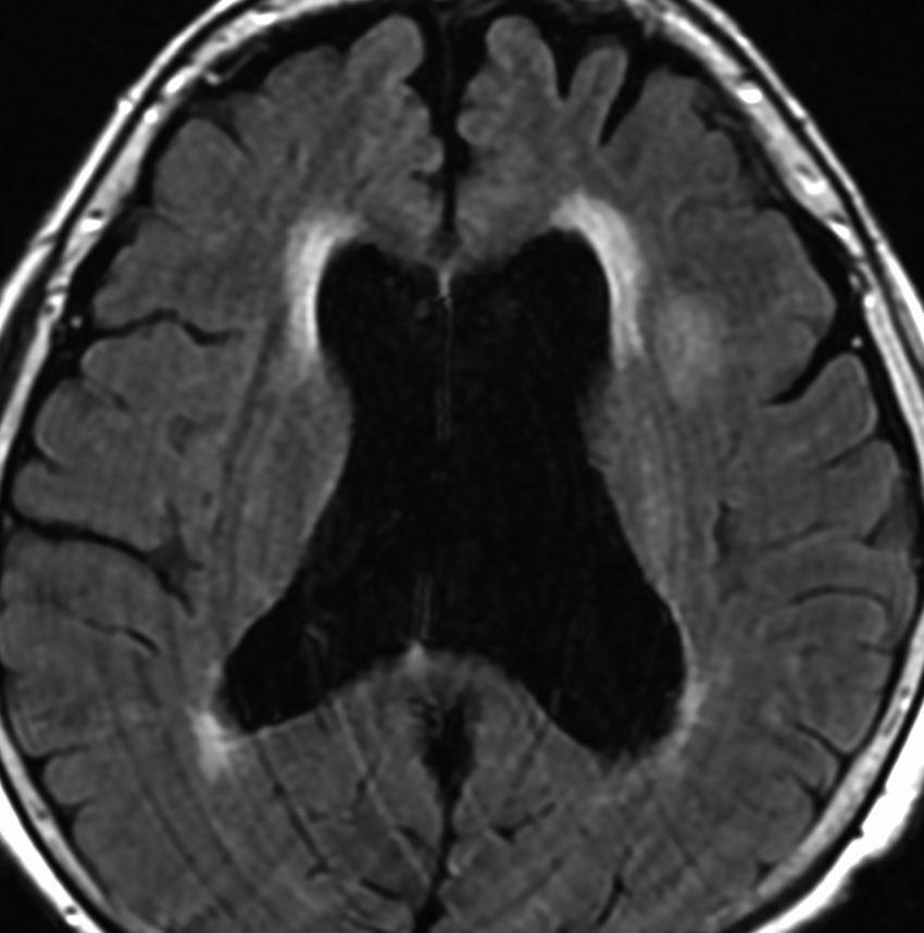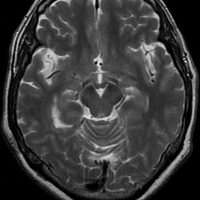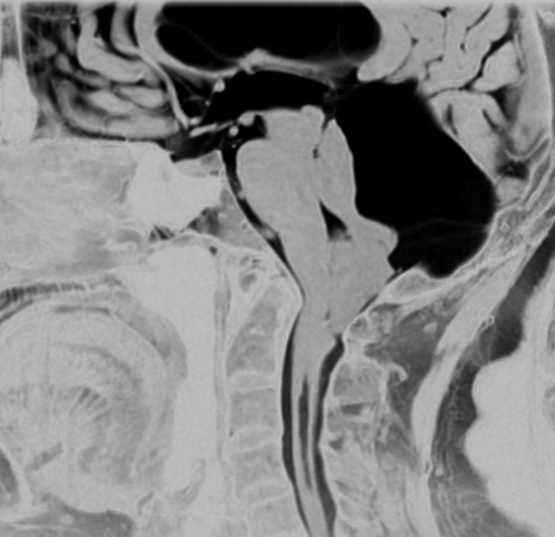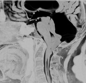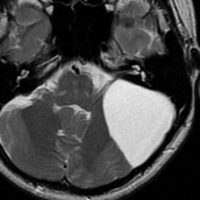 高齢の女性のくも膜のう胞です。テント下,上小脳槽にある大きなくも膜のう胞です。小脳扁桃ヘルニアになり,脊髄空洞症を併発しています。第4脳室出口の閉塞で水頭症となっていました。症状は数年かかって徐々に進行した歩行障害で,転倒しやすくなったとの主訴で受診しました。これは,のう胞壁を開頭手術で摘出する必要があるものです。数十年もある大きなのう胞ですから,意外に周囲の脳槽は狭いものです。実際に顕微鏡手術で,迂回槽と交通をつけるようにのう胞壁を除去したのですが,髄液交通を確保するのはとても難しいものでした。内視鏡ではリスクが高いかもしれません。