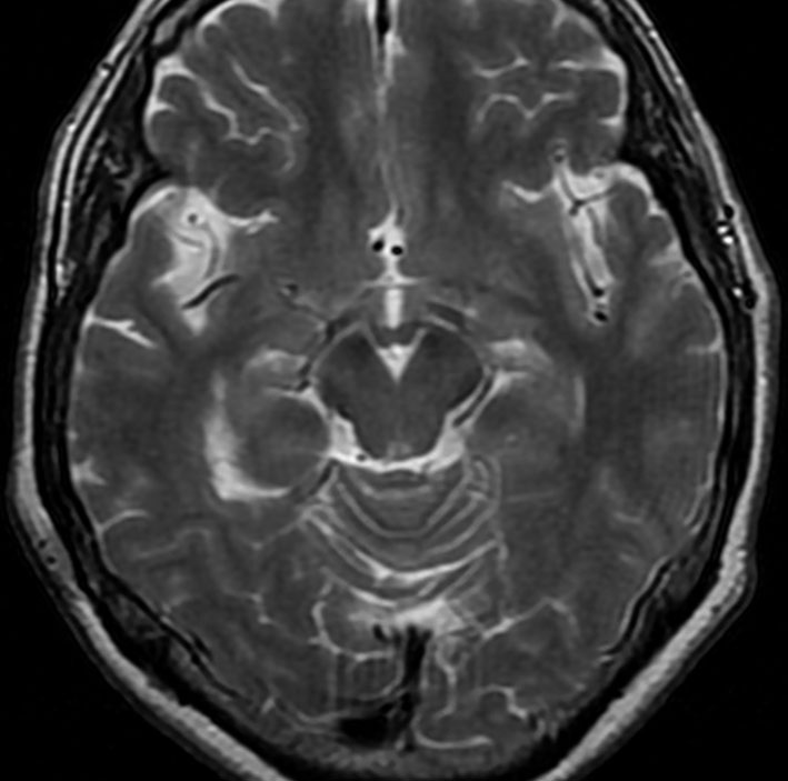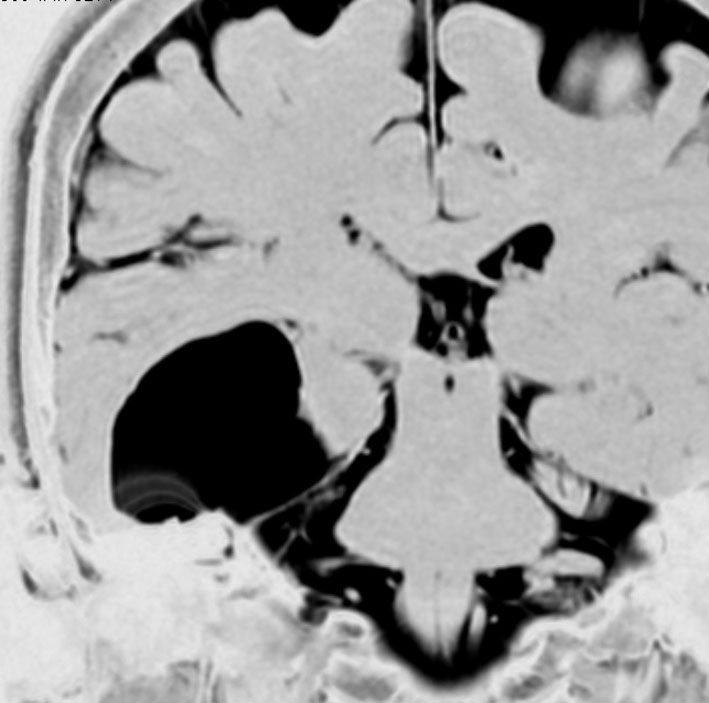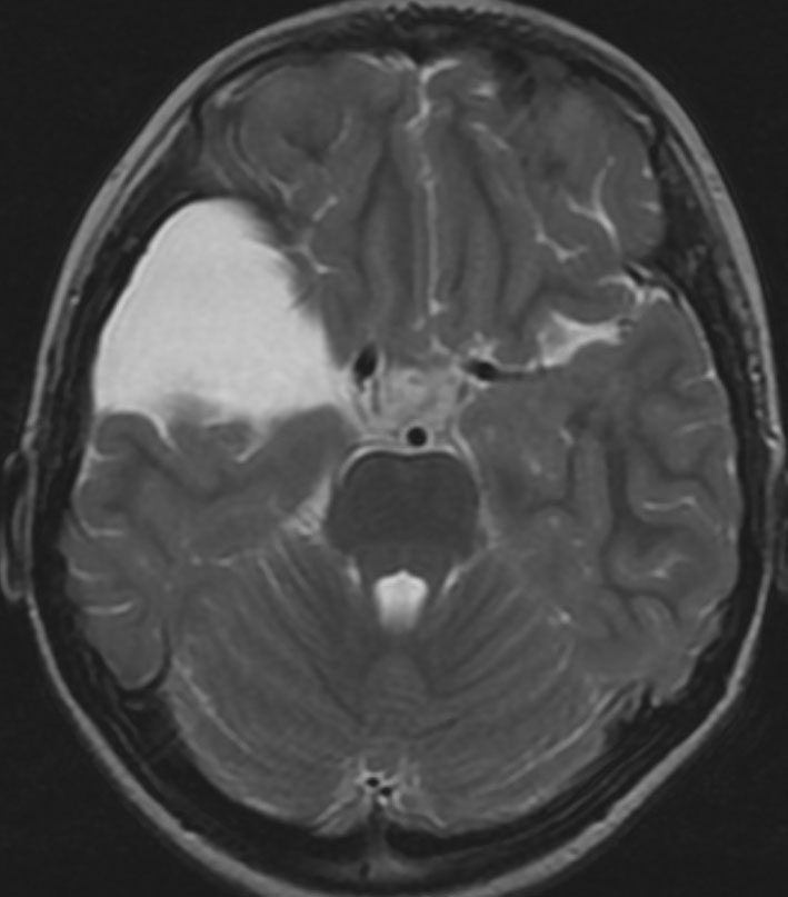 最も多いタイプで50%くらいです。7歳の子に偶然発見された右シルビウス裂のくも膜のう胞です。大きいのですがこの程度では治療の必要はありません。シルビウス裂のくも膜のう胞は最も多いものです。