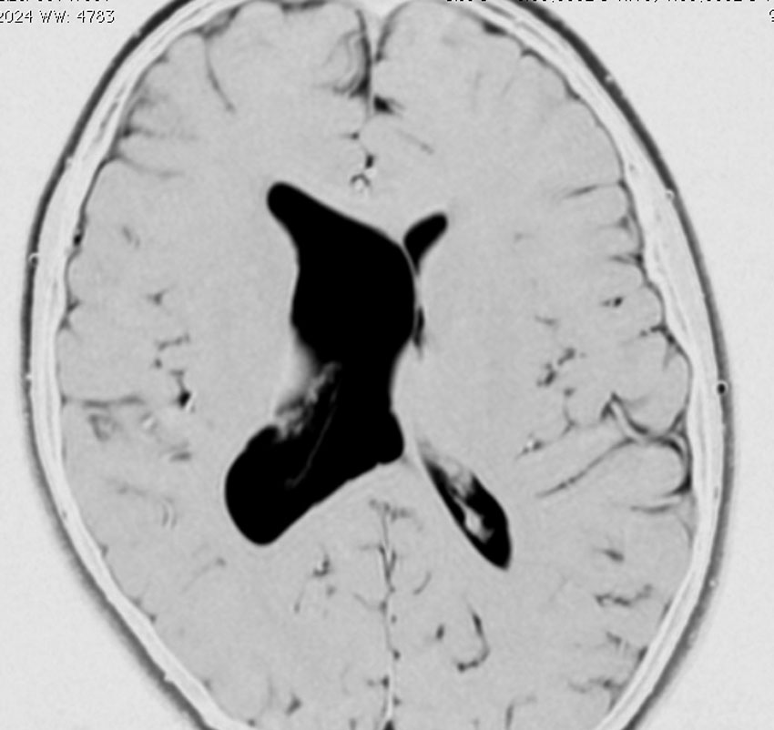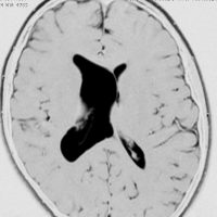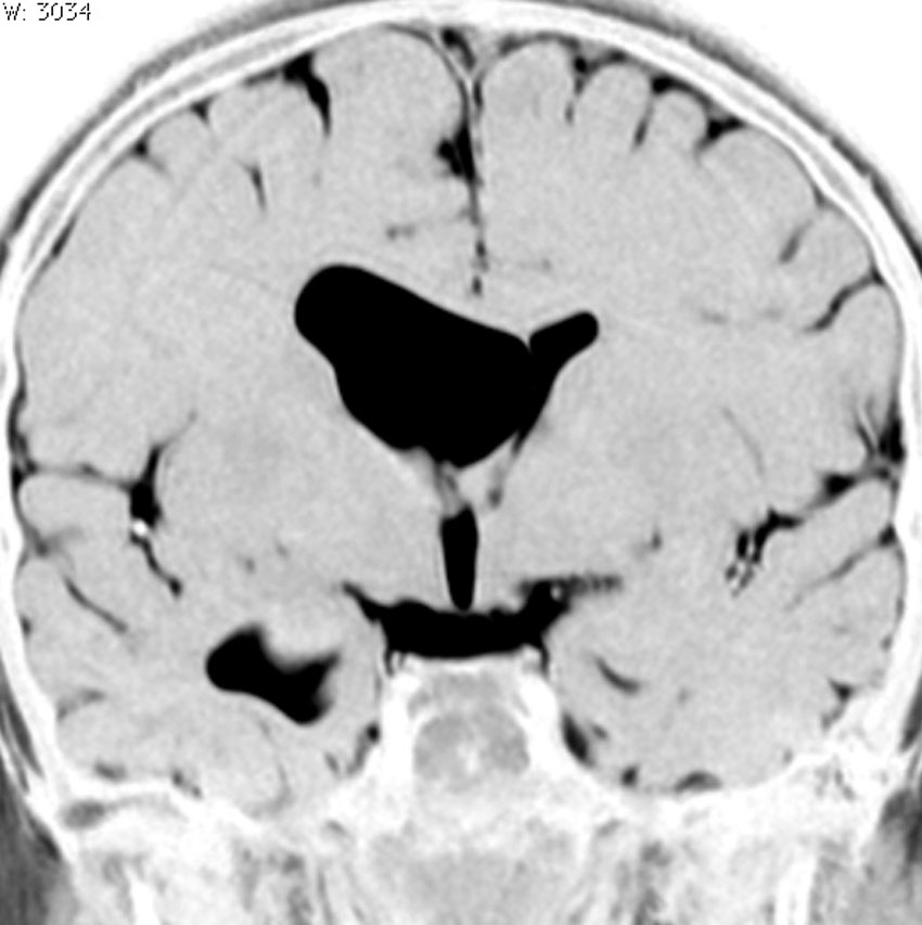 これは11歳の子供で偶然発見された右側脳室くも膜のう胞です。無症状で変化しませんからほっておきます。右のモンロー孔に狭窄があるために右側脳室だけの停止性水頭症になっています。