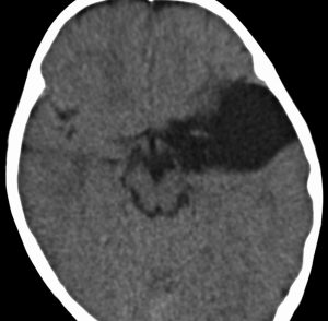 くも膜のう胞が脳室内にできて,脳室の一部で髄液の流れをさまたげて,部分的な水頭症になることがあります。水頭症になっても停止性水頭症というもので悪化傾向がなければ治療の必要がありません。多くは側頭角というところが拡大するのですが,拡大傾向がはっきりしたら,内視鏡手術でくも膜のう胞の壁を切除します。