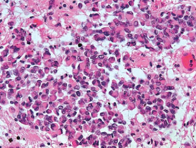 Macroscopically, AT/RT resembles medulloblastoma and sPNET. The tumors are soft, pale pink and show areas of hemorrhage as well as necrotic regions. Very commonly rhabdoid cells characterized by eosinophilic cytoplasm, large nuclei with excentric nucleoli and a prominent membrane as well as cytoplasmic eosinophilic inclusion bodies are seen. These diagnostic cells may be grouped in nests close to areas composed of neuroectodermal, mesenchymal or epithelial tissue types. Only about 10 to 15% of AT/RT consist almost exclusively of rhabdoid cells. AT/RT exhibit a broad spectrum of immunohistochemical reactions corresponding to the different tissue subtypes. Rhabdoid cells are characterized by expression of vimentin, EMA (epithelial membrane antigen) and cytokeratins, less commonly by SMA (smooth muscle actin). The immunohistochemical demonstration of lost INI1 protein expression in the tumor cells is a strong indicator for AT/RT, however, rare AT/RT with preserved INI1 expression are also on record.