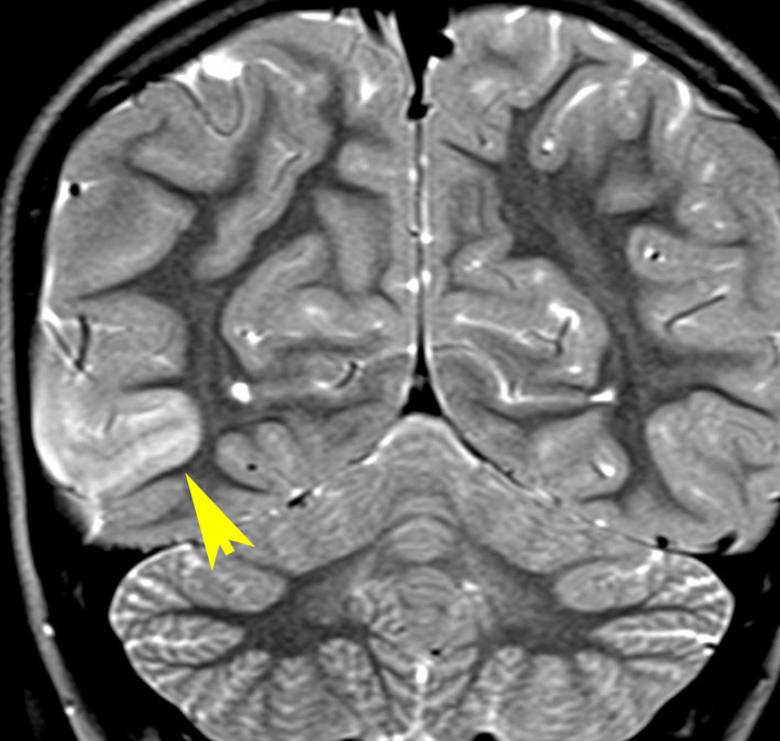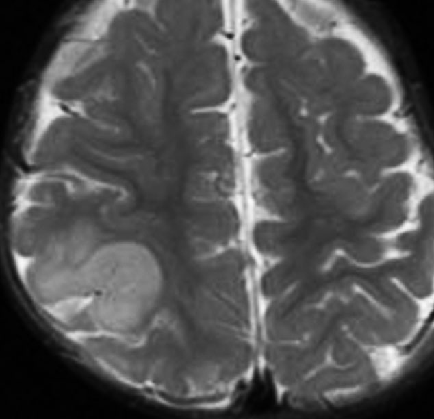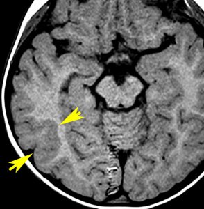 右頭頂葉の皮質異形成です。生後2週間目に両上肢を挙げるような発作を生じて難治化,1歳を超える頃には発達の遅れが目立ちました。新生児期にはMRIで描出できなかった病変が1歳になって初めて写るようになりました。手術で病変摘出 lesionectomy して投薬中断ができて,その後は普通に育ちました。