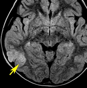 低悪性度グリオーマと間違われることがありますが,大脳皮質だけが異常な信号になっていて,皮質下白質に異常所見がないことが鑑別点です。