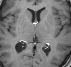 多くは側脳室の中にみつかります。丸いものや楕円形のものがあります。これも脳腫瘍と間違われることがあるのですが,脈絡叢にくっつく位置にあって,内部が髄液であることで区別できます。脳室内脈絡叢のう胞と脳室内くも膜のう胞は区別できませんが,両方ともほっておけばいいので心配ありません。
