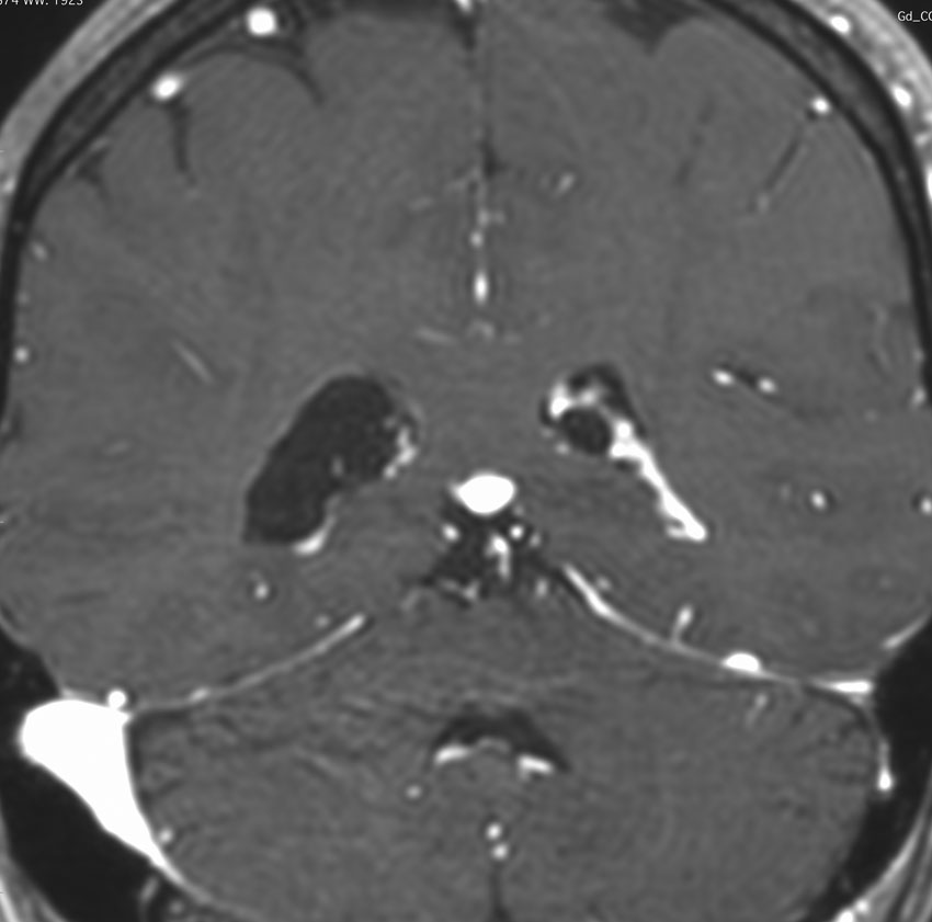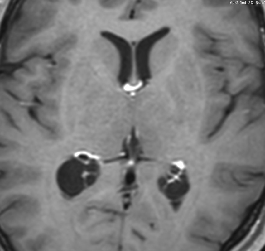 これも側脳室三角部の両側性の脈絡叢のう胞です。ガドリニウム増強で,脈絡叢が固まっていなくてばらけたように見えます。