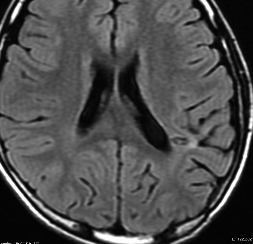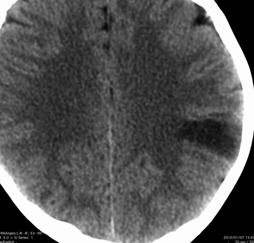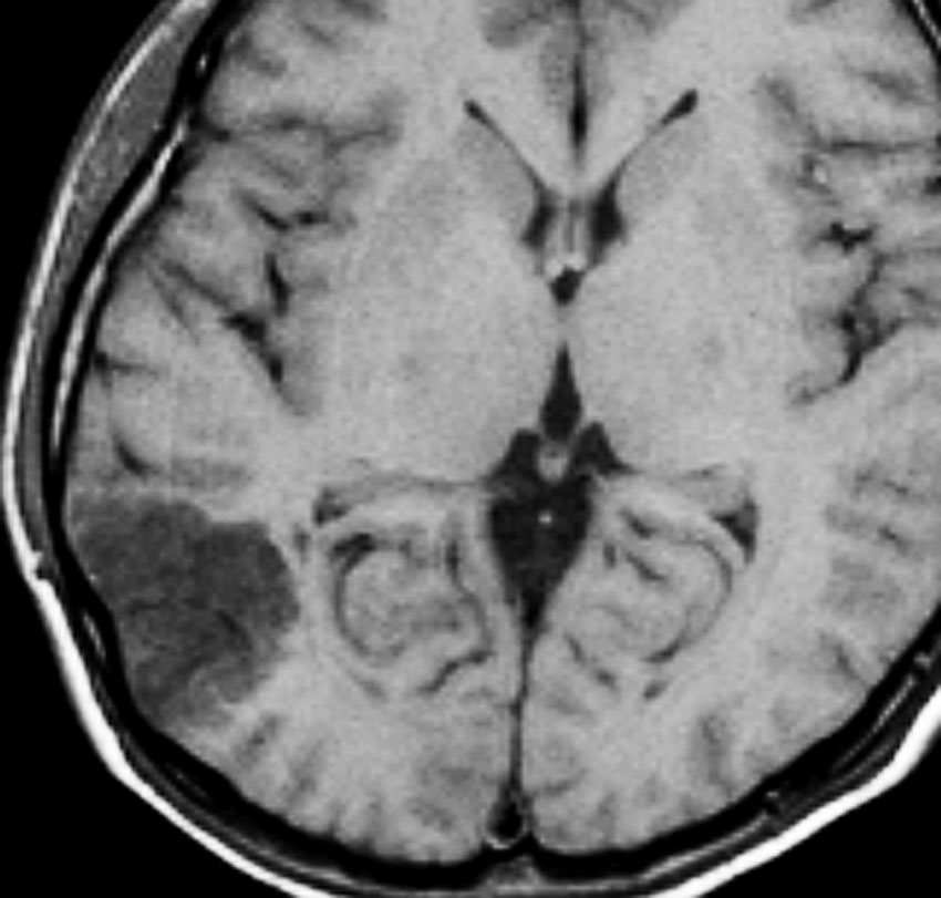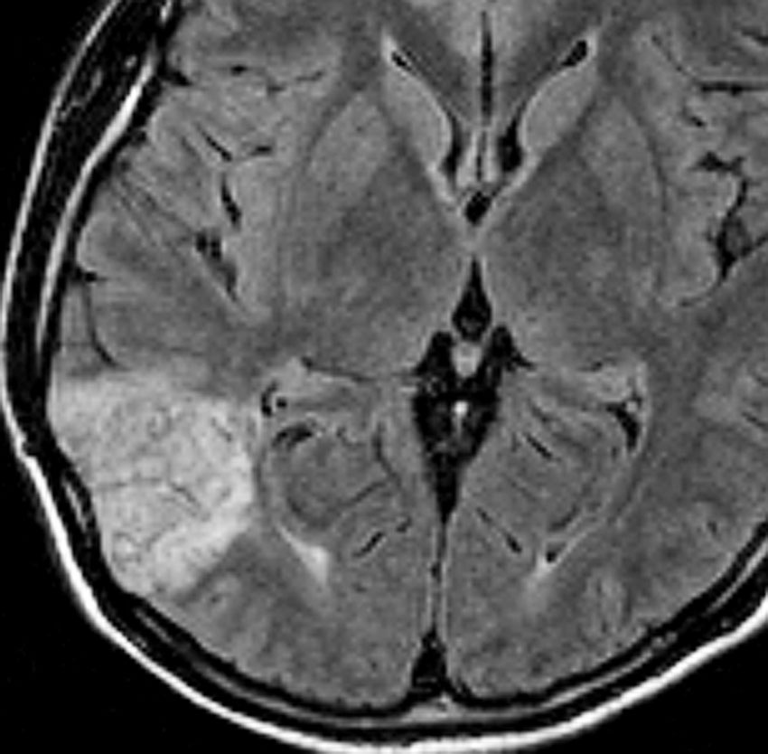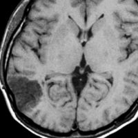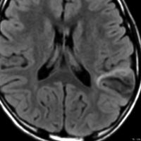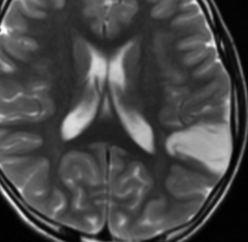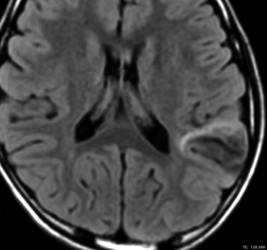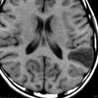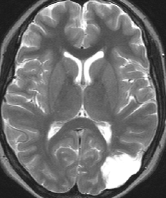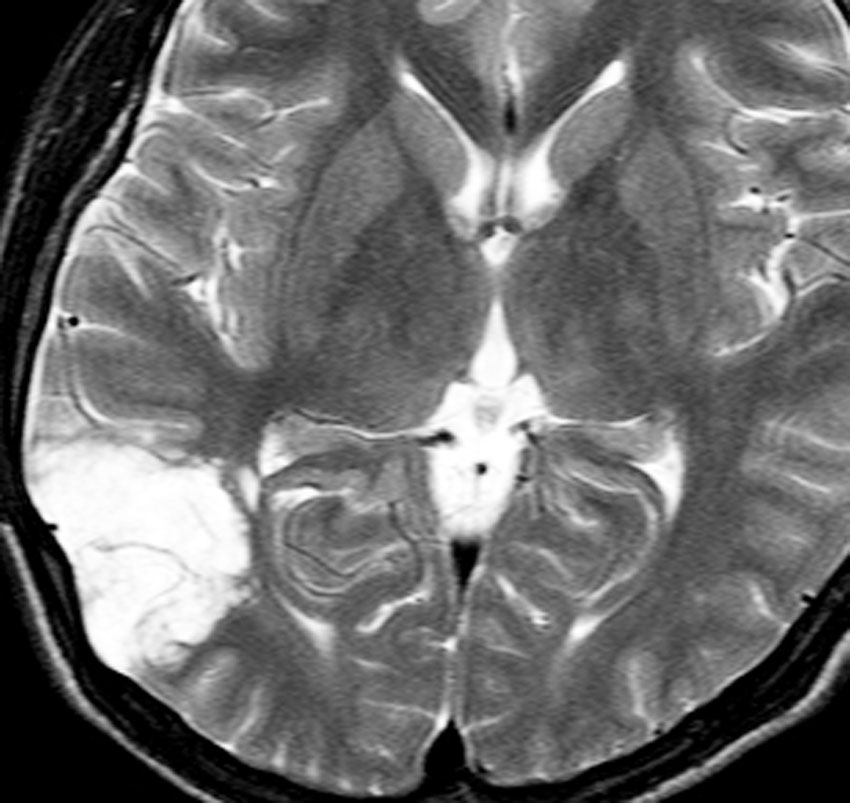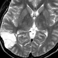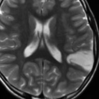 10代の少女に見つかったDNTです。難治性のてんかんがあり1日になんども意識減損を生じて,けいれんを止める薬をたくさん飲んでいて副作用のために眠気で日常生活が困難でした。でも,他の症状は何もありませんでした。左の頭頂葉と側頭葉と後頭葉の境目にできたものです。おそらくお母さんのお腹の中いたときからあった腫瘍なので何もしないで様子を見てもいいのです。でも,てんかん発作がひどいので腫瘍だけを摘出しました。DNTだけを取っても後遺症が残ることはほとんどありません。この場所は周囲の脳組織をとると後遺症がでる場所 (eroquent area)なので,てんかんを止める目的でもかなりの理由がないと周囲の脳組織は摘出しません。この子は,抗てんかん薬もいらなくなって完治しました。