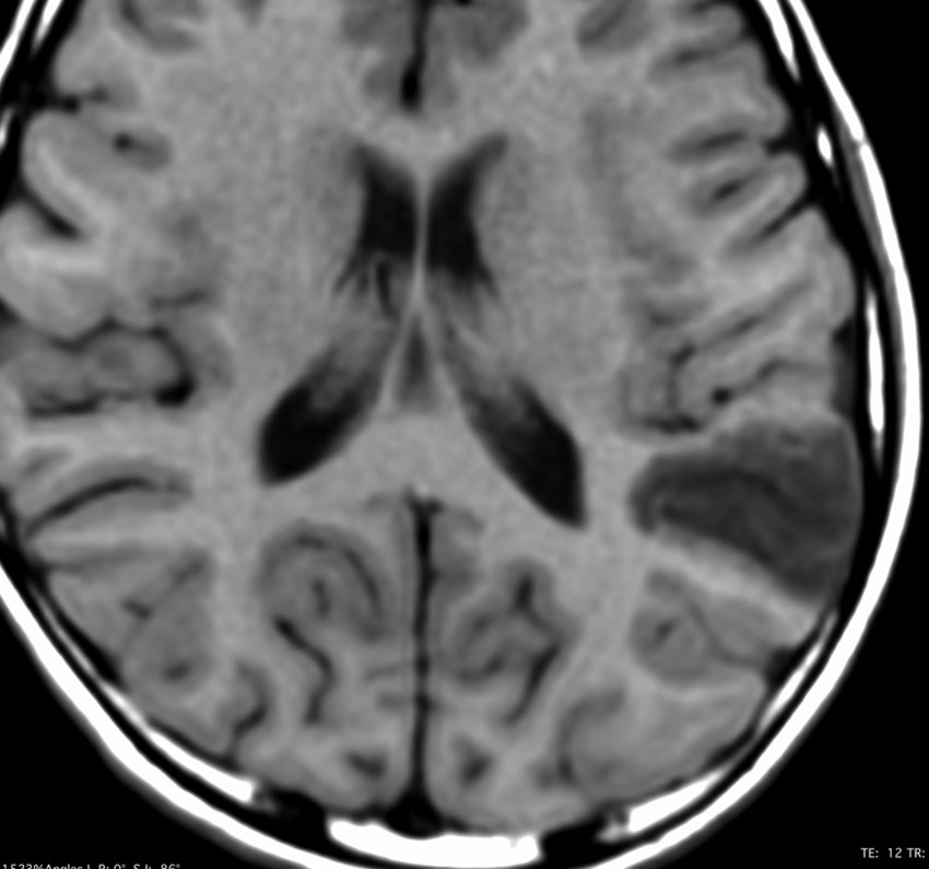 典型的なDNTの画像で説明するまでもありません。ガドリニウムでは全く増強されませんでした。左上側頭回と角回の境界域に存在します。